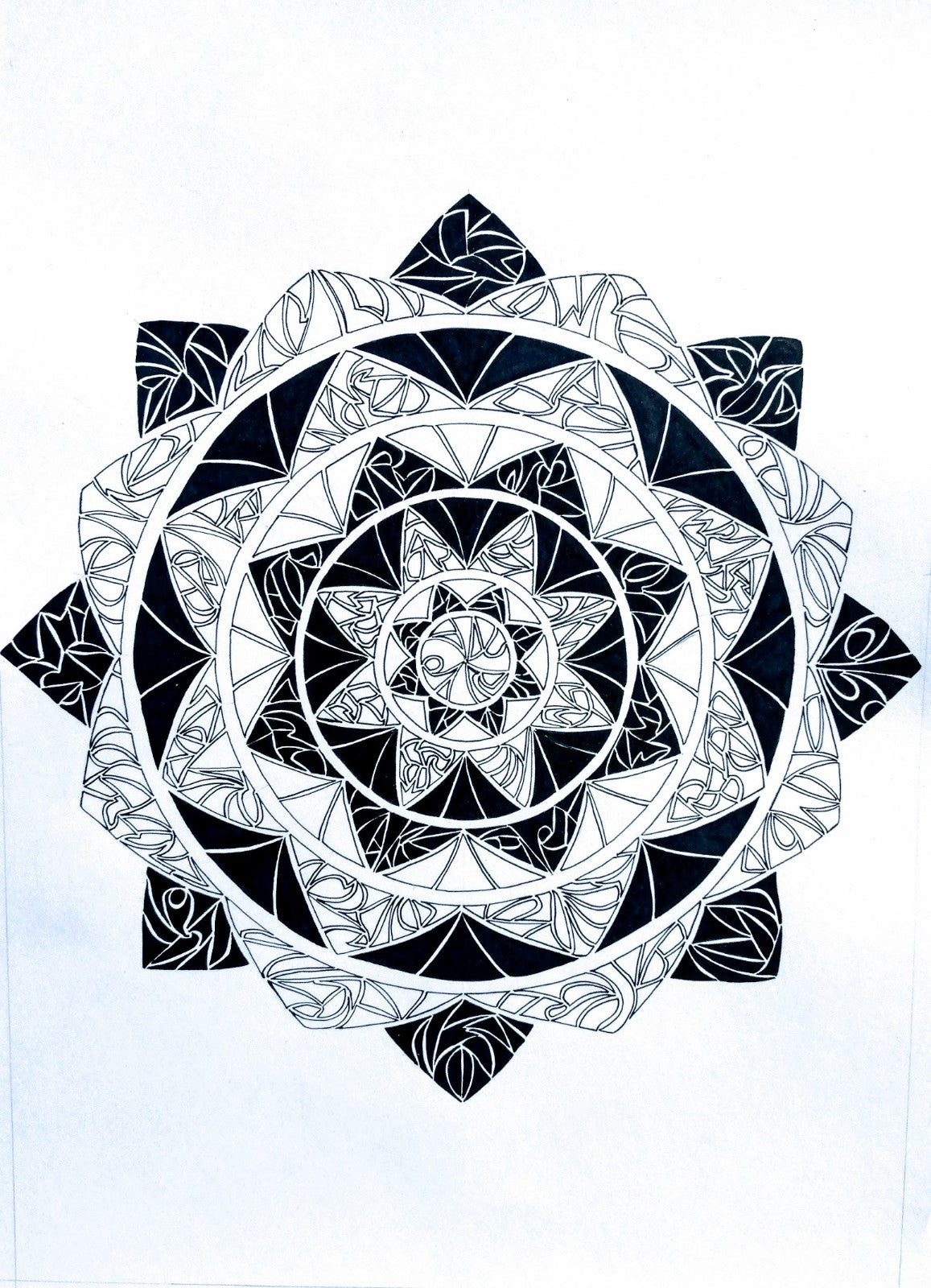 January is always a mundane month for me creatively, so I always try to push myself to create. This intricate design was done in pen in January 2024 and took hours of time. Especially all the tiny leaves in the outer area.