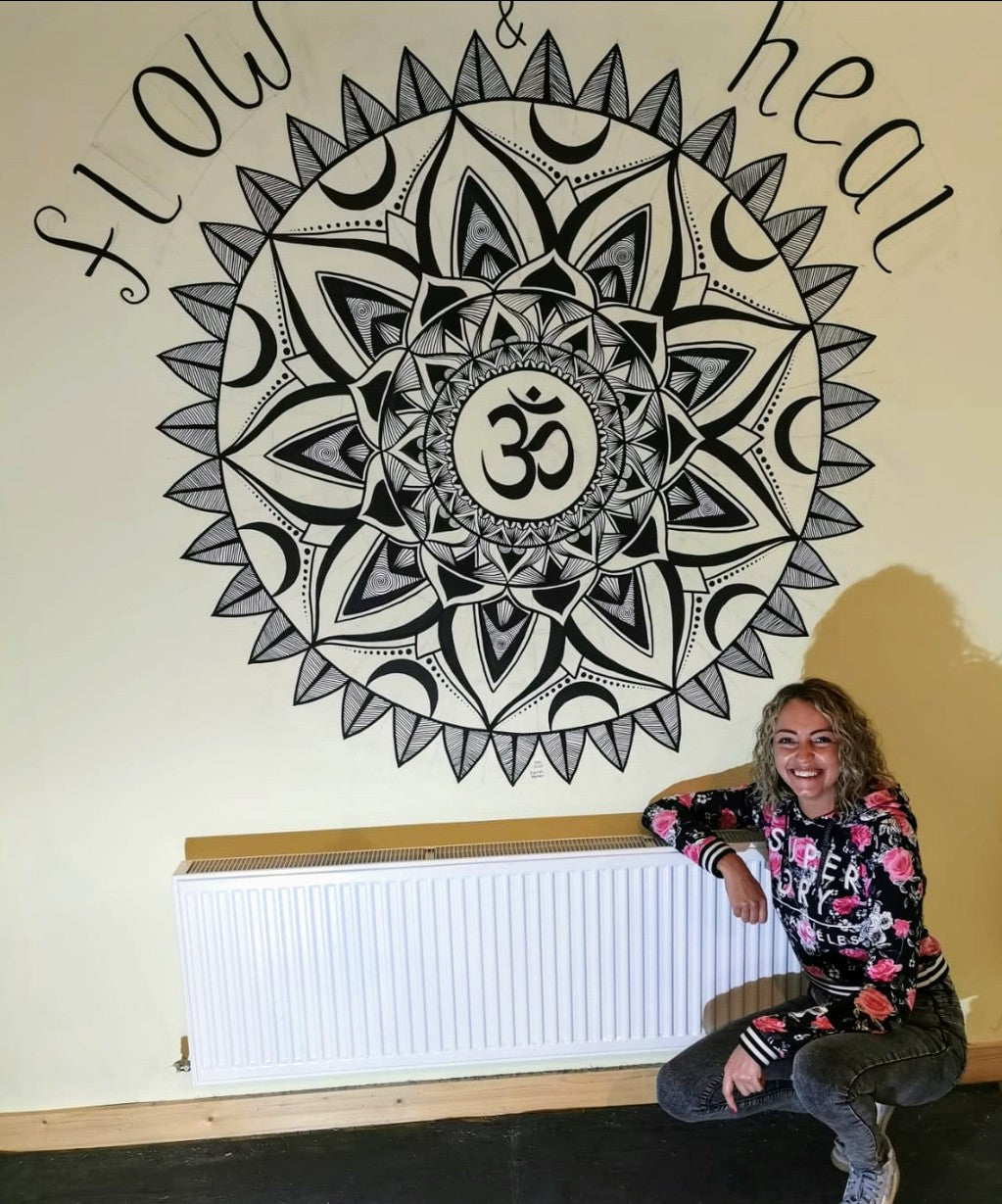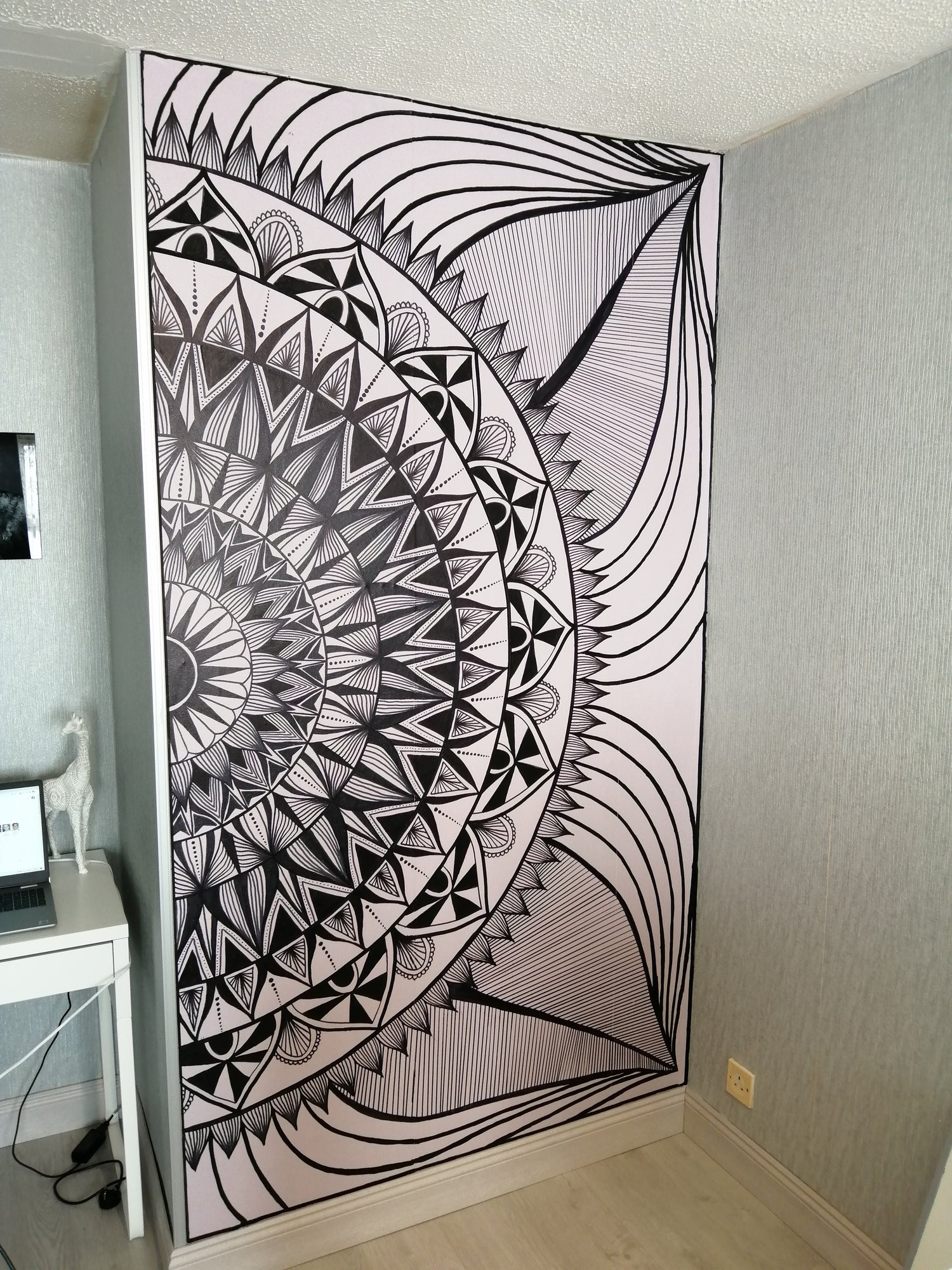 I was commissioned by a good friend of mine to do this giant mandala in his kitchen back in 2021. It took a number of nights and I freestyled pretty much the entire thing. I took a lot of inspiration from items around the kitchen and even used a cereal bowl to create the crescent moon shapes. I enjoyed creating this and my friend cherishes this view in his kitchen every day!