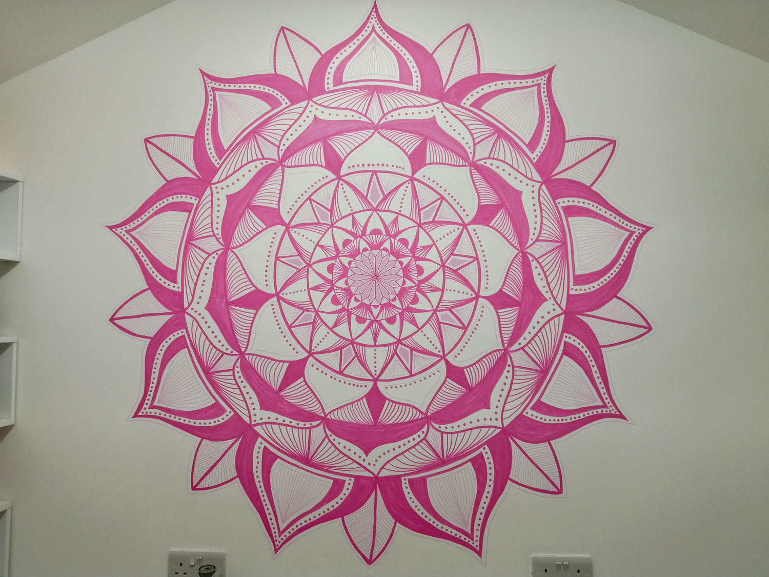 A mandala commissioned by my longest and dearest friend, who owns a Nail Salon. She didn't have a preference for the style, but wanted it to be pink. I was able to freestyle the design and painted it entirely with pink posca paint markers.